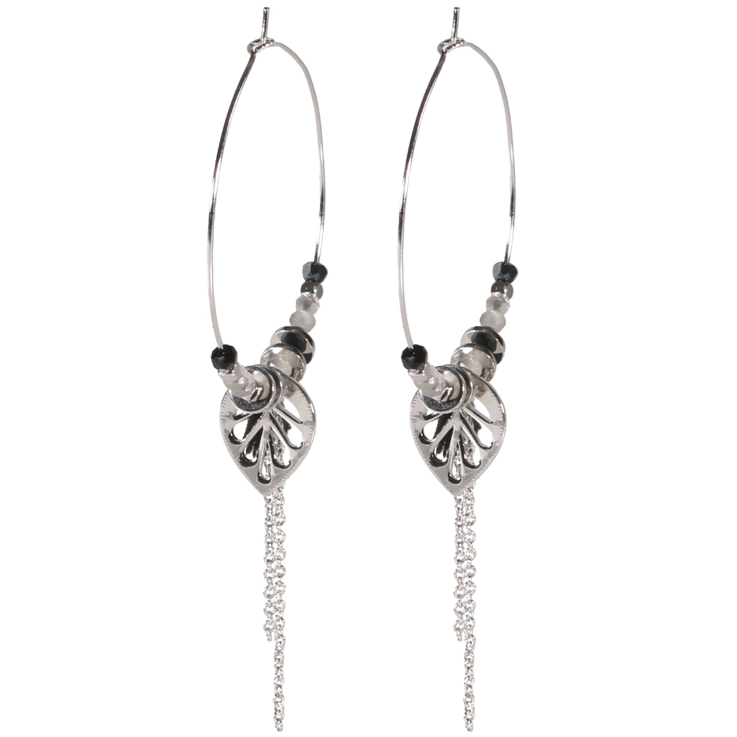 Boucles d'oreilles créoles avec feuilles et chaînettes pendantes en acier argenté, perles de couleur et pompon en textile.