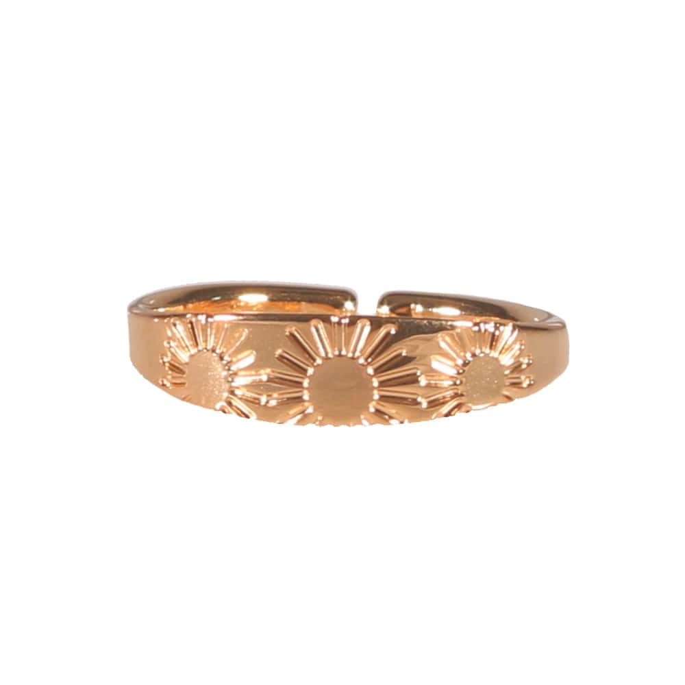 Description Bague avec motifs de soleil en acier rosé. Taille ajustable. Largeur 5 mm Matière(s) Acier . L'acier utilisé dans la bijouterie existe sous plusieurs qualités. Nous utilisons principalement la qualité 316L, qualité qui est utilisée en chirurgie. Cet acier est donc inoxydable et reste très résistant. À noter Taille ajustable Couleur(s) dominante(s) Rose Public Adolescent , Adulte . Genre Femme , Fille . Saison Indémodable . Thème(s) Nature . Collection Astre sublime , My Sun Cliquez sur une matière, un thème, une couleur ou une collection pour voir tous les articles associés.