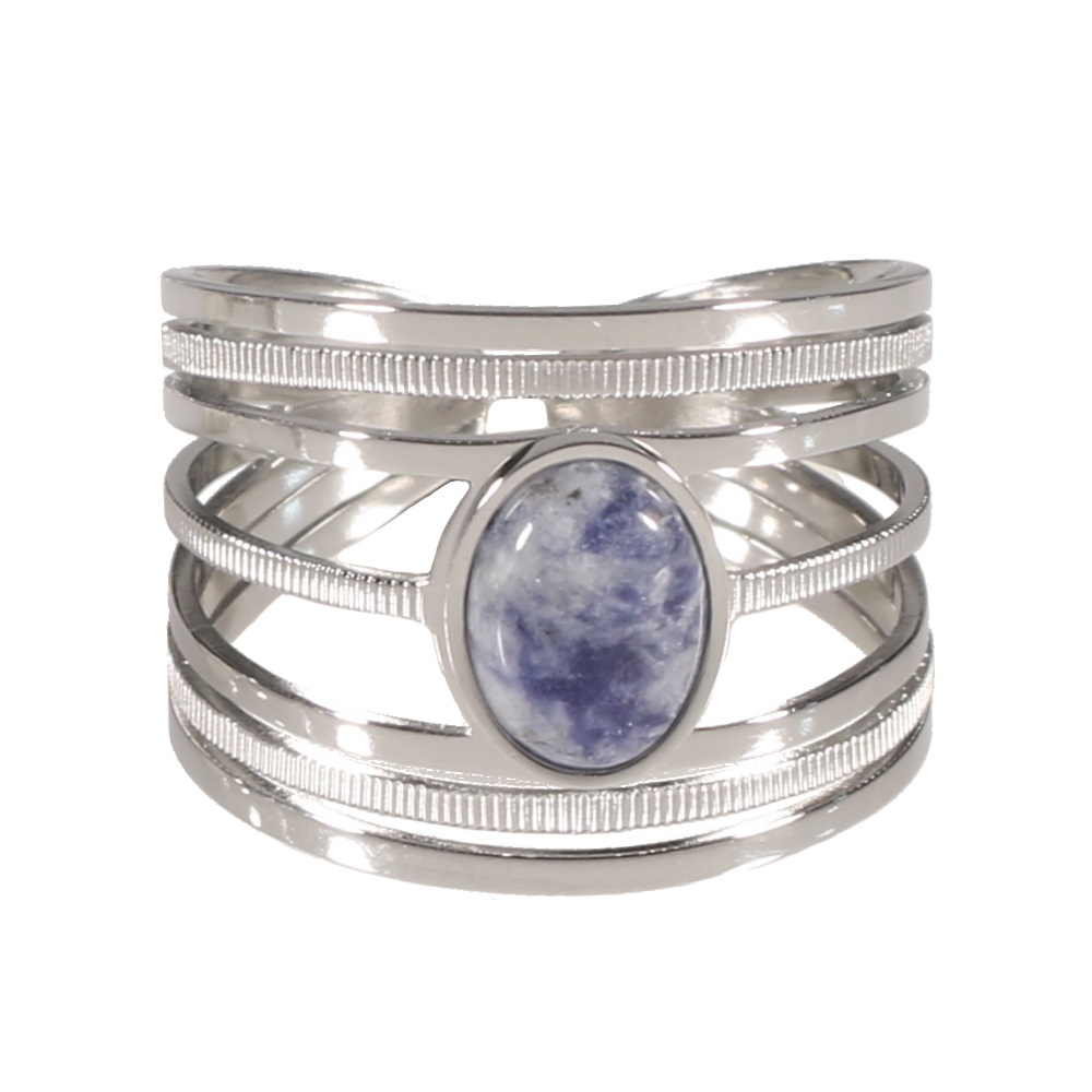 Bague multi rangs en acier 316L argenté montée d'une pierre de couleur bleue de forme ovale.