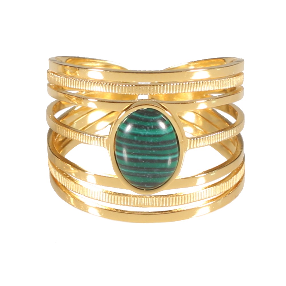Bague multi rangs en acier 316L doré montée d'une pierre d'imitation malachite de forme ovale.
