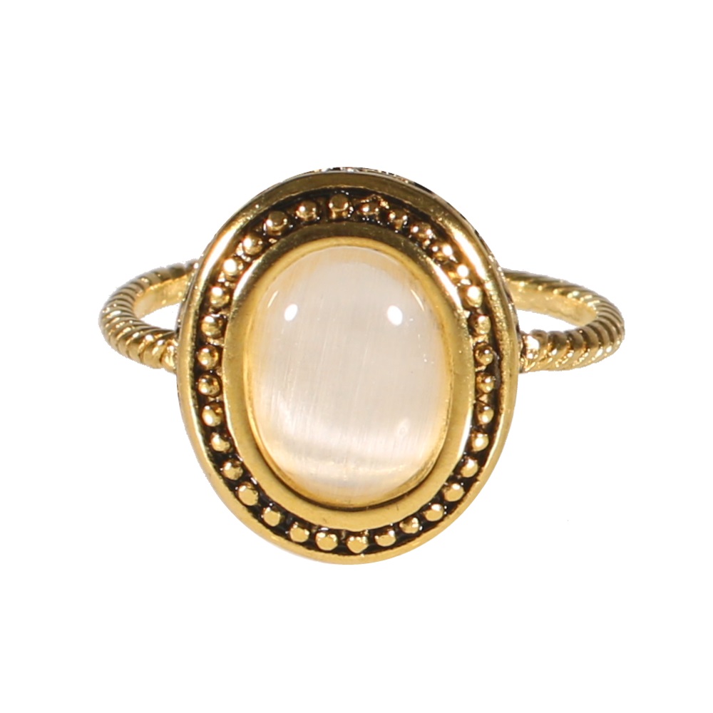 Bague en acier 316L doré montée d'une pierre de couleur blanche de forme ovale.
