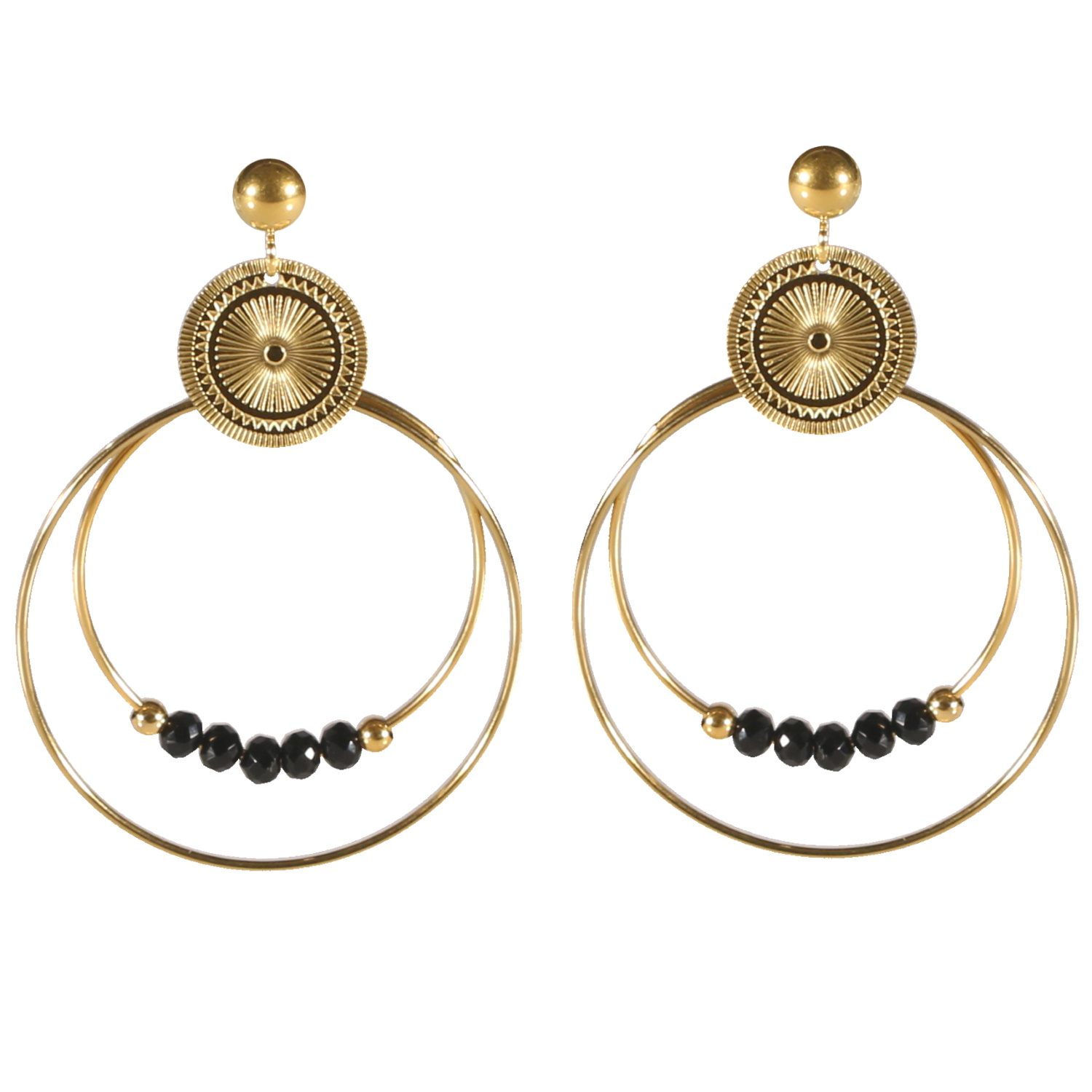 Description Boucles d'oreilles pendantes composées d'une puce boule, d'une pastille ronde avec motifs et de deux cercles en acier doré surmontés de perles de couleur noire. Largeur 32 mm Hauteur 47 mm Matière(s) Acier , Rocaille . L'acier utilisé dans la bijouterie existe sous plusieurs qualités. Nous utilisons principalement la qualité 316L, qualité qui est utilisée en chirurgie. Cet acier est donc inoxydable et reste très résistant. Fermoir Tiges poussettes Couleur(s) dominante(s) Doré , Noir Public Adolescent , Adulte . Genre Femme , Fille . Saison Indémodable . Cliquez sur une matière, un thème, une couleur ou une collection pour voir tous les articles associés.
