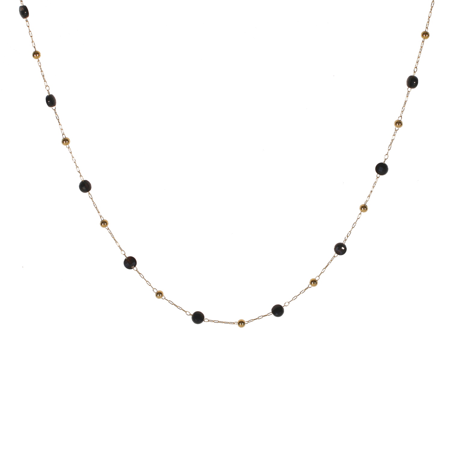 Description Collier composé d'une chaîne avec boules en acier doré et de perles en véritable pierre d'agate noire. Fermoir mousqueton avec 7 cm de rallonge. Cliquez sur une matière, un thème, une couleur ou une collection pour voir tous les articles associés.