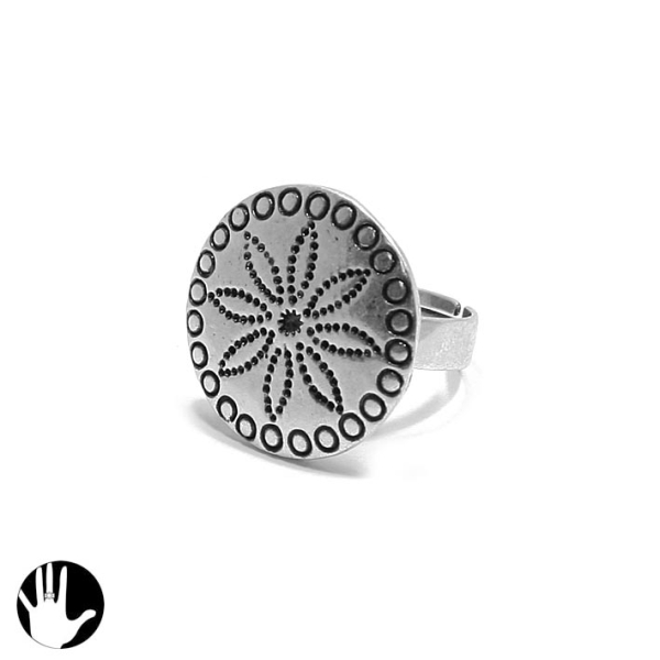 Bague fantaisie en métal argenté vieilli. Large Rond  Adulte Femme Fleurs Indémodable