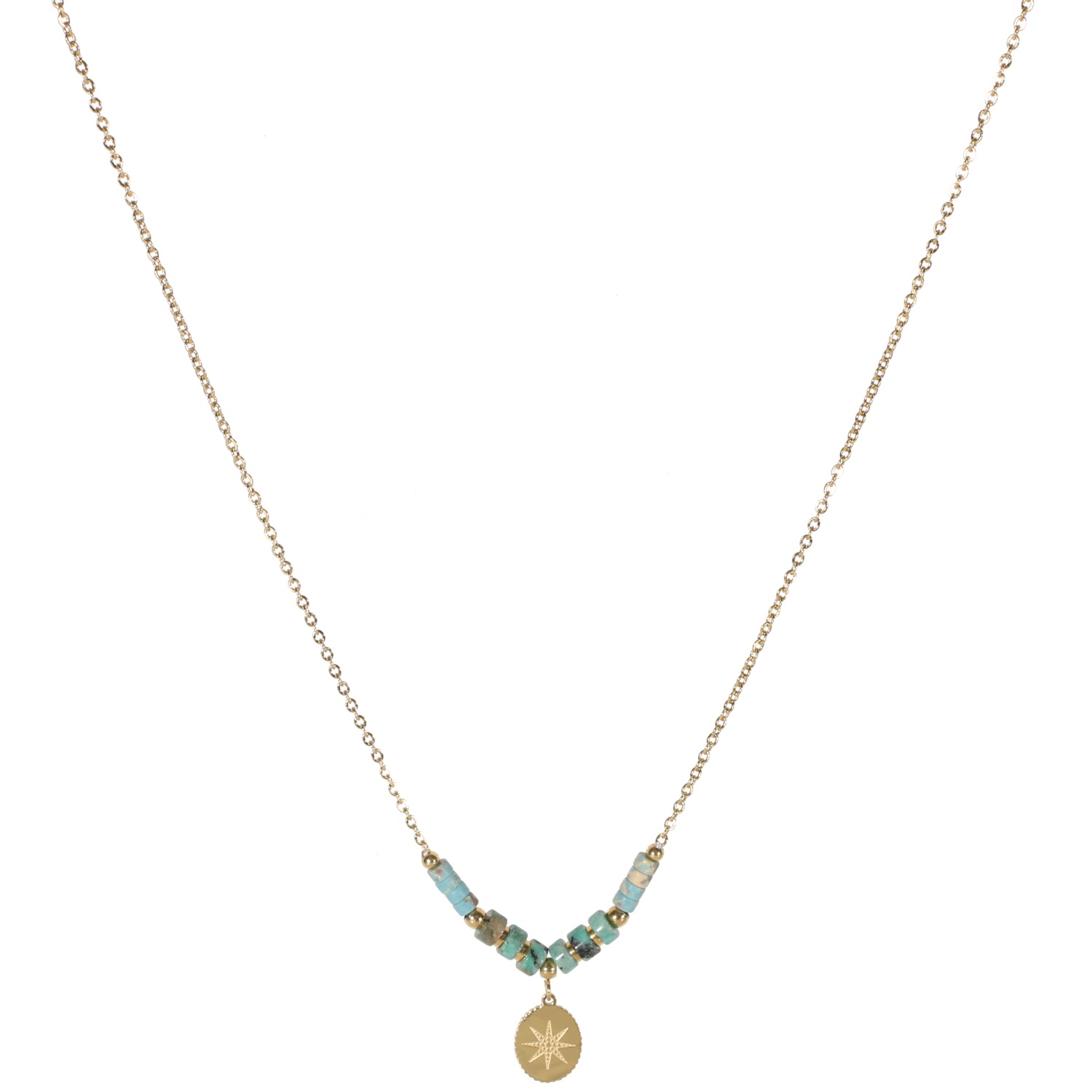 Collier chaîne en acier doré finissant par des perles cylindriques de couleur turquoise et un pendentif de forme ovale avec motif d'étoile gravé.