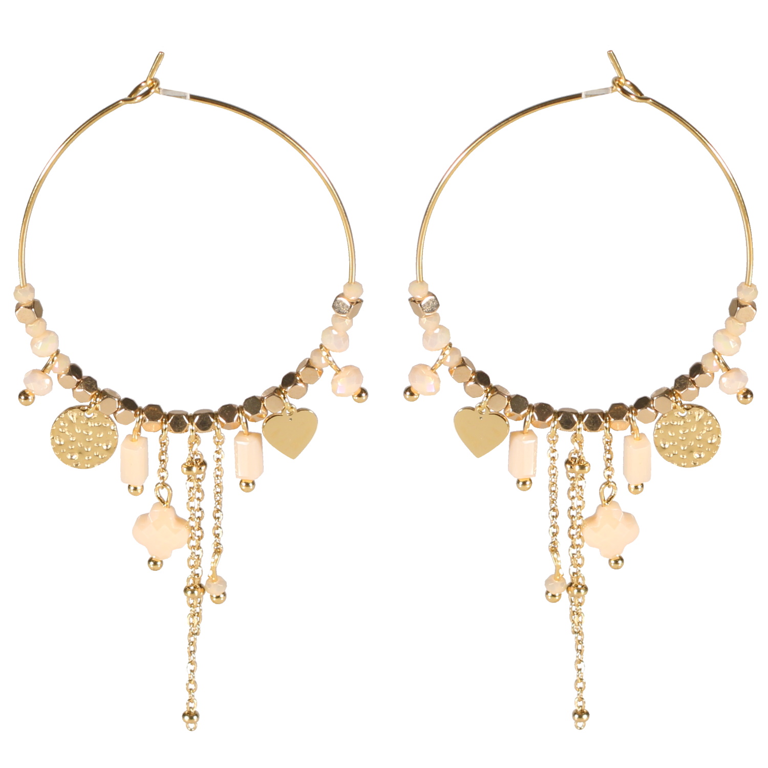 Description Boucles d'oreilles créoles avec pendants (chaînettes, cœur, pastille ronde martelée) et perles cubiques en acier 316L doré et perles de couleur écru. Hauteur 70 mm Diamètre 35 mm Matière(s) Acier , Rocaille . L'acier utilisé dans la bijouterie existe sous plusieurs qualités. Nous utilisons principalement la qualité 316L, qualité qui est utilisée en chirurgie. Cet acier est donc inoxydable et reste très résistant. Fermoir Autre Couleur(s) dominante(s) Blanc , Doré , Marron Public Adolescent , Adulte . Genre Femme , Fille . Saison Indémodable . Thème(s) Amour . Cliquez sur une matière, un thème, une couleur ou une collection pour voir tous les articles associés.
