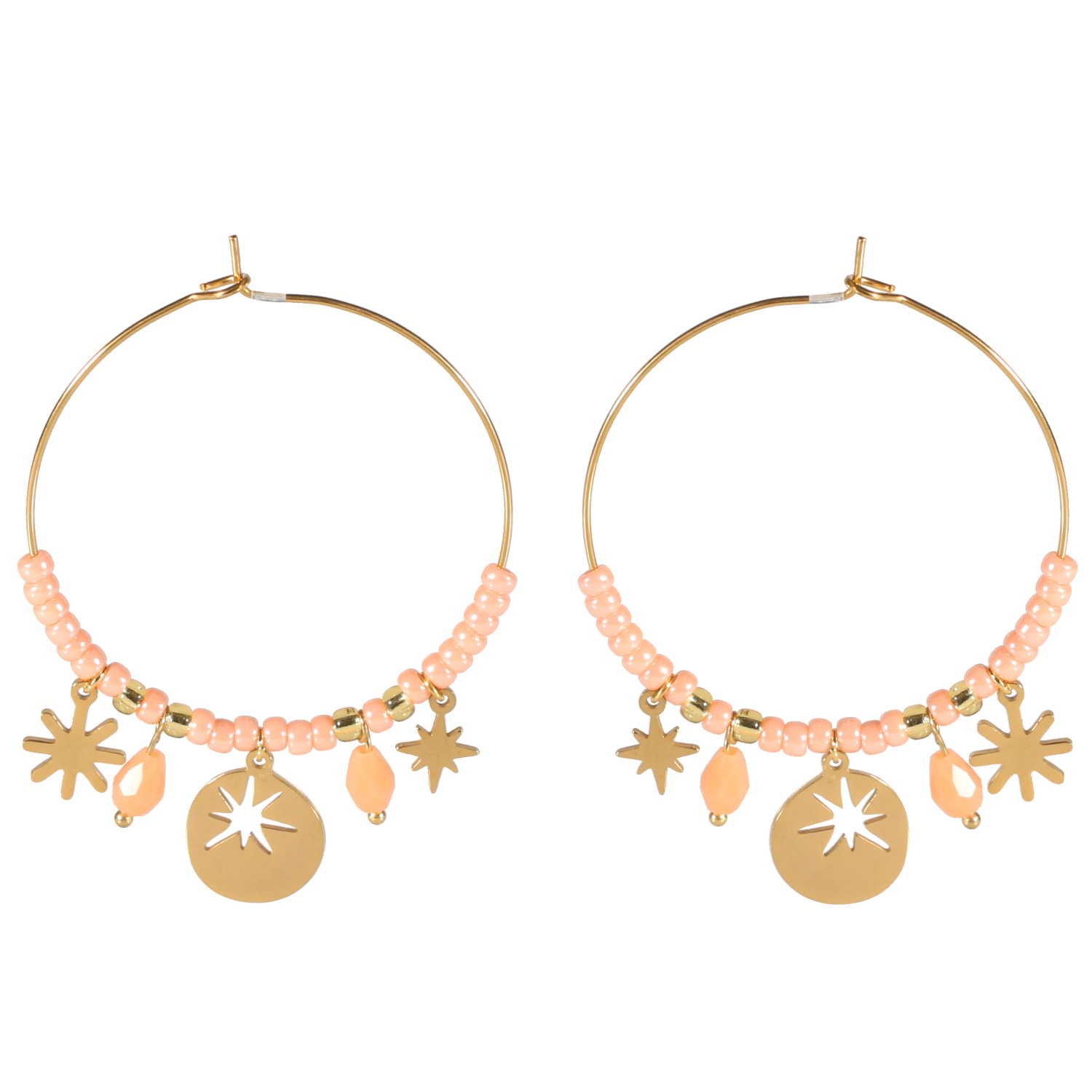 Boucles d'oreilles créoles avec pendants au motifs d'étoiles en acier doré et perles de couleur.