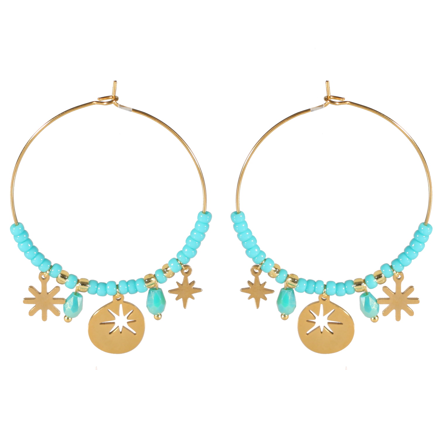 Boucles d'oreilles créoles avec pendants au motifs d'étoiles en acier doré et perles de couleur.
