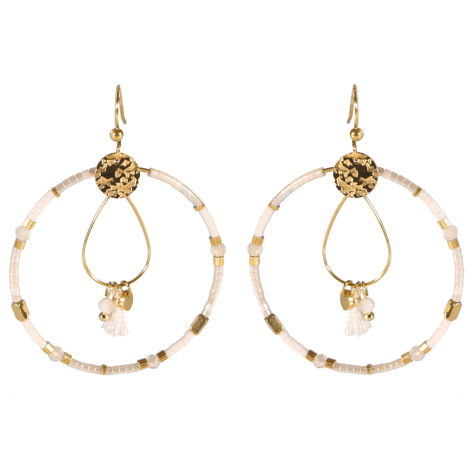 Boucles d'oreilles pendantes composées d'une pastille ronde martelée en acier doré, un cercle de perles de couleur et un cercle ovale avec une perle de couleur, une petite pastille ronde et un mini pompon.