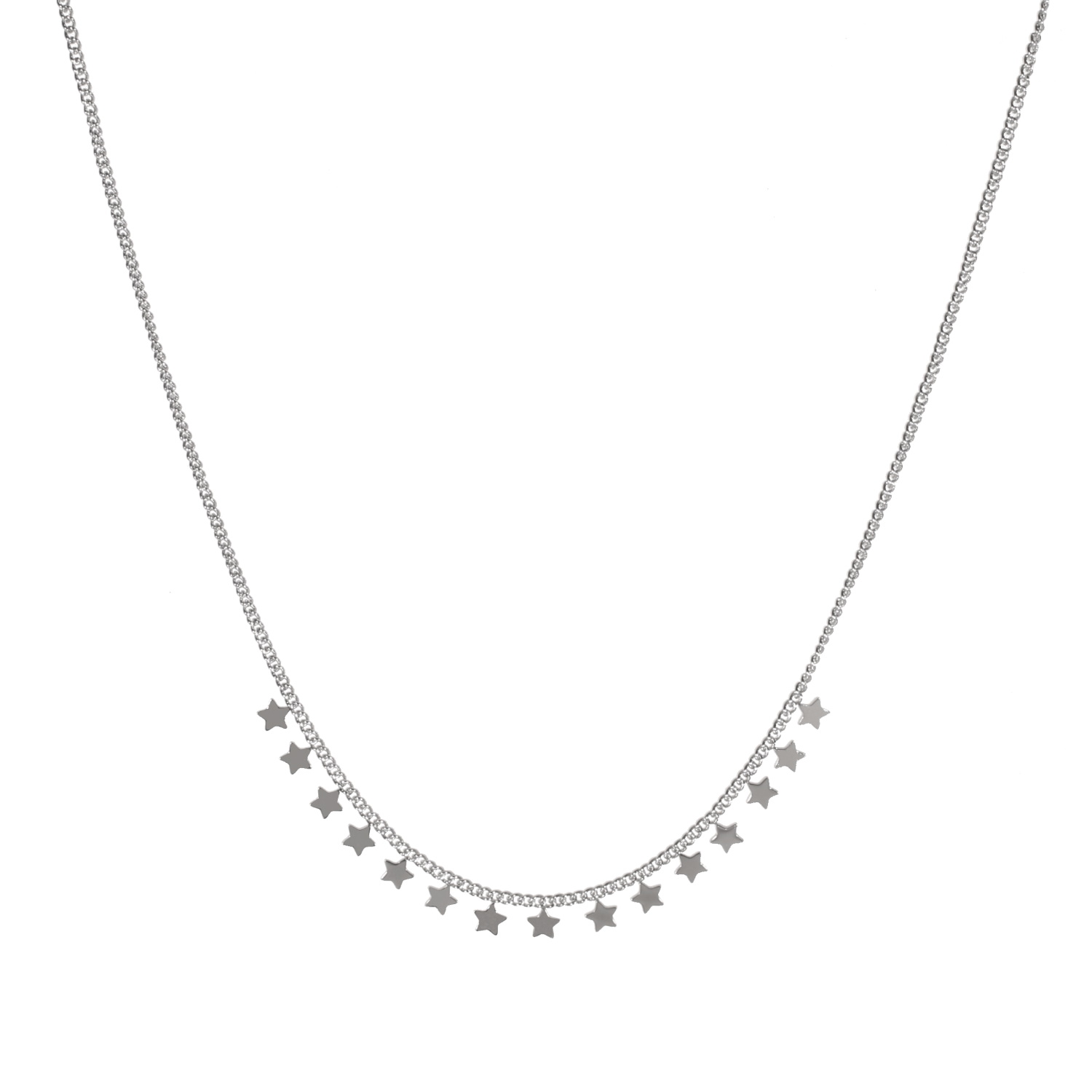 Description Collier avec pampilles étoiles en acier argenté. Fermoir mousqueton avec 7 cm de rallonge. Cliquez sur une matière, un thème, une couleur ou une collection pour voir tous les articles associés.