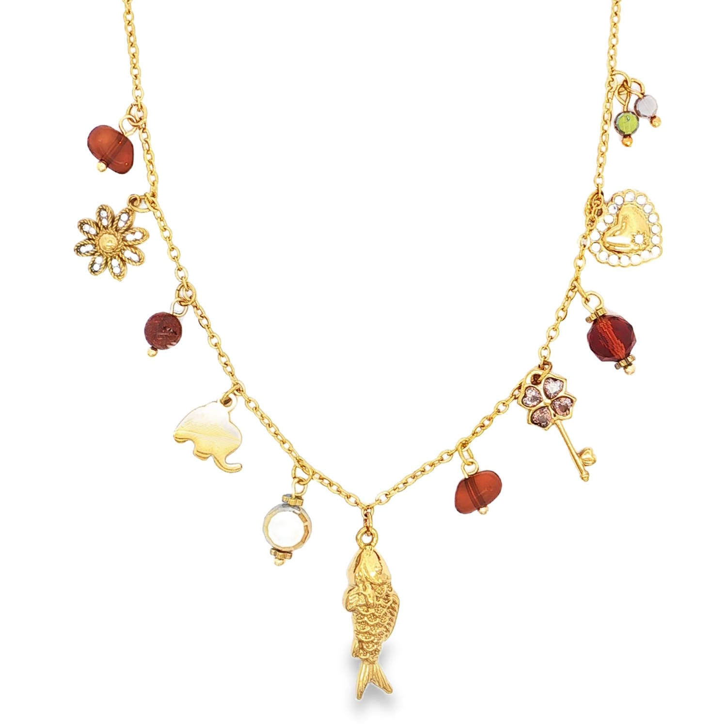 Ce bijou fantaisie présente une chaîne délicate ornée de divers motifs charmants, ajoutant une touche de fantaisie et de personnalité à votre tenue.