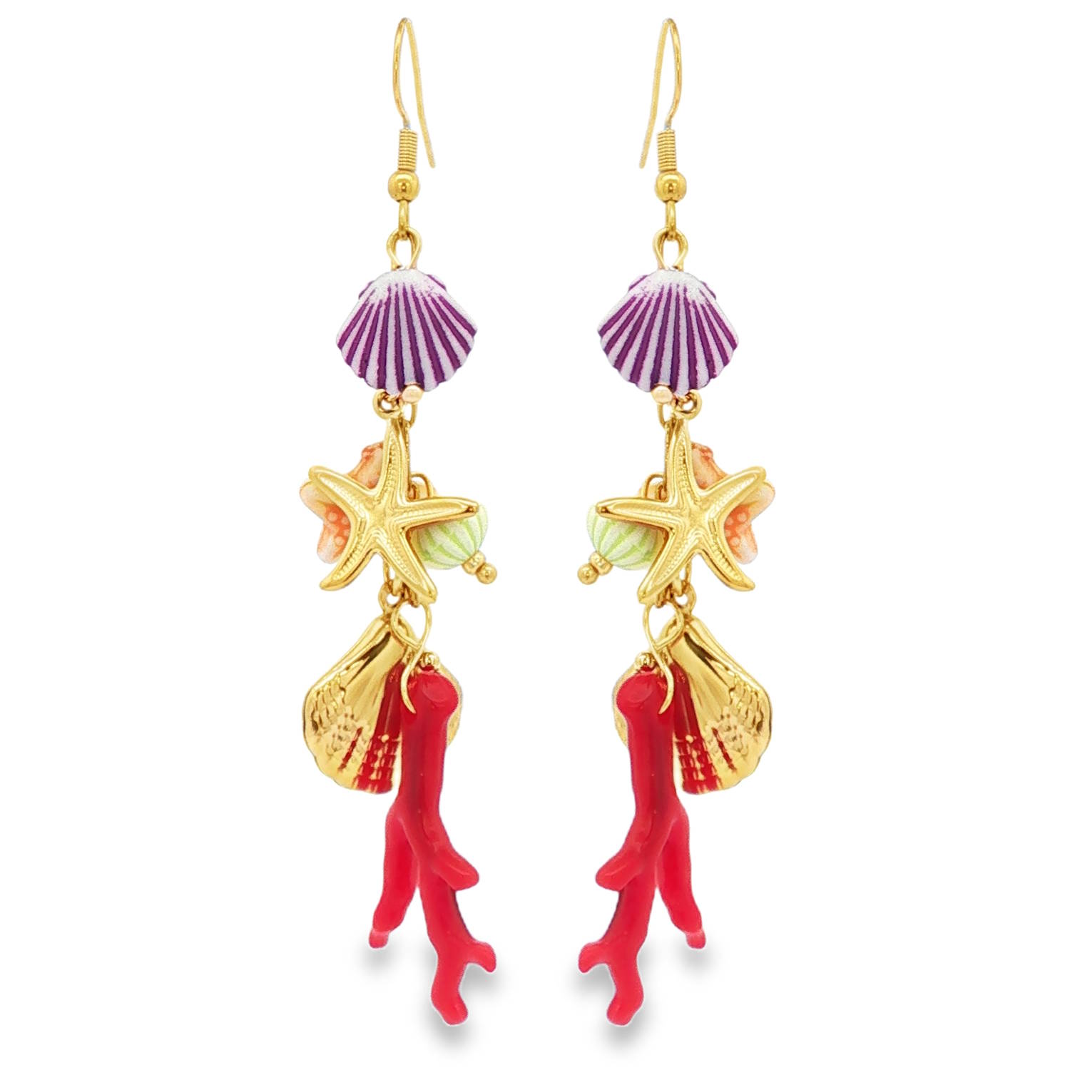 Description Ces magnifiques boucles d'oreilles pendantes capturent l'essence même de l'océan avec un design asymétrique et coloré. Conçues en acier inoxydable doré, elles allient robustesse et éclat pour un style estival affirmé. Chaque boucle est une véritable composition de trésors marins. On y retrouve une succession de breloques minutieusement travaillées. Un coquillage strié dans les tons violet et blanc au sommet. Une étoile de mer dorée superposée à un petit élément vert pastel. Une conque dorée brillante à la base. Une branche de corail rouge vif suspendue en cascade pour apporter une touche de dynamisme et de longueur. Largeur 16 mm Hauteur 78 mm Matière(s) Acier , Résine . L'acier utilisé dans la bijouterie existe sous plusieurs qualités. Nous utilisons principalement la qualité 316L, qualité qui est utilisée en chirurgie. Cet acier est donc inoxydable et reste très résistant. Fermoir Crochets Couleur(s) dominante(s) Doré , Multicolore Public Adolescent , Adulte . Genre Femme , Fille . Saison Eté , Printemps . Thème(s) Animaux , Nature . Collection Seaside Cliquez sur une matière, un thème, une couleur ou une collection pour voir tous les articles associés.