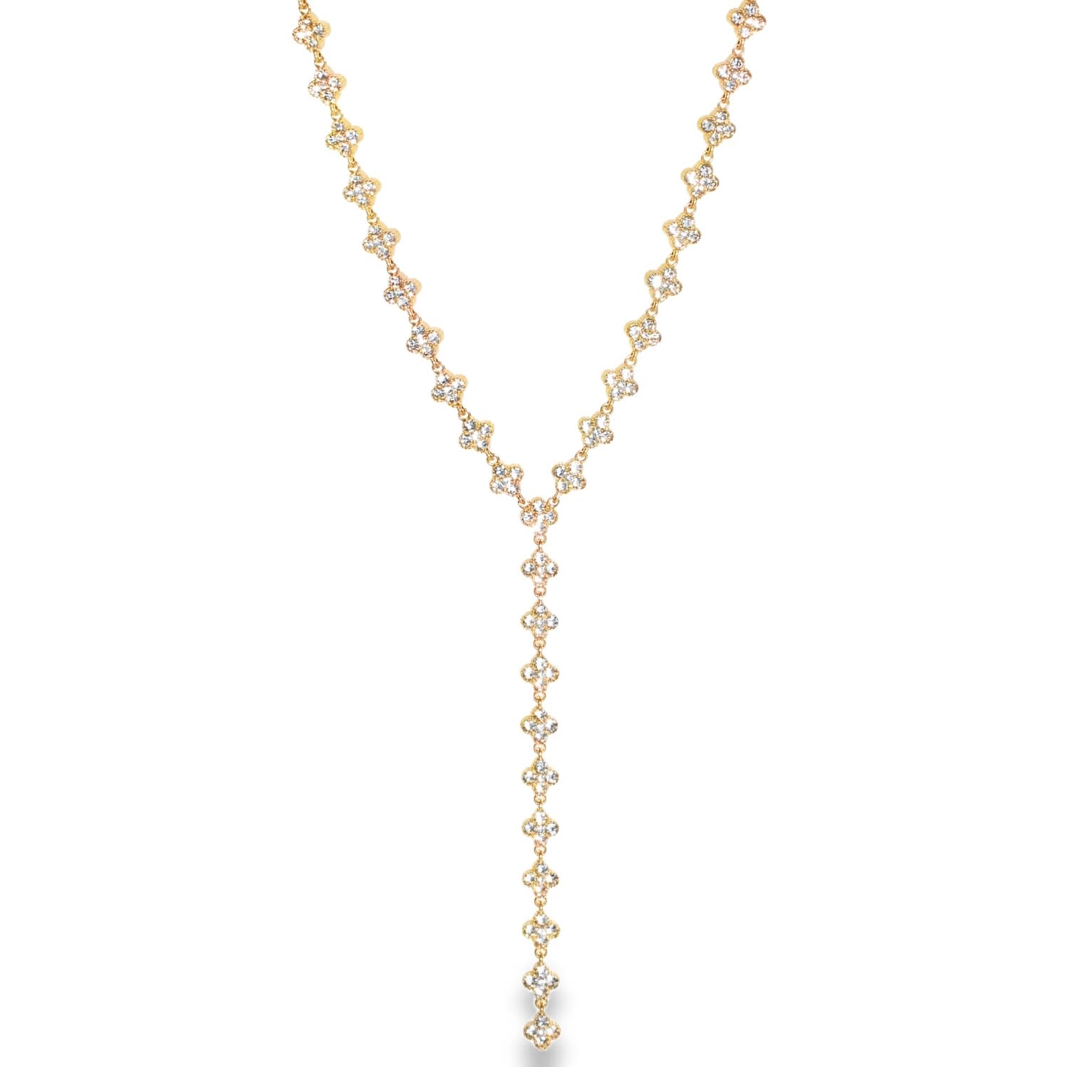 Le collier se distingue par sa forme en V qui se prolonge par une délicate chute verticale, créant un effet élancé et féminin.