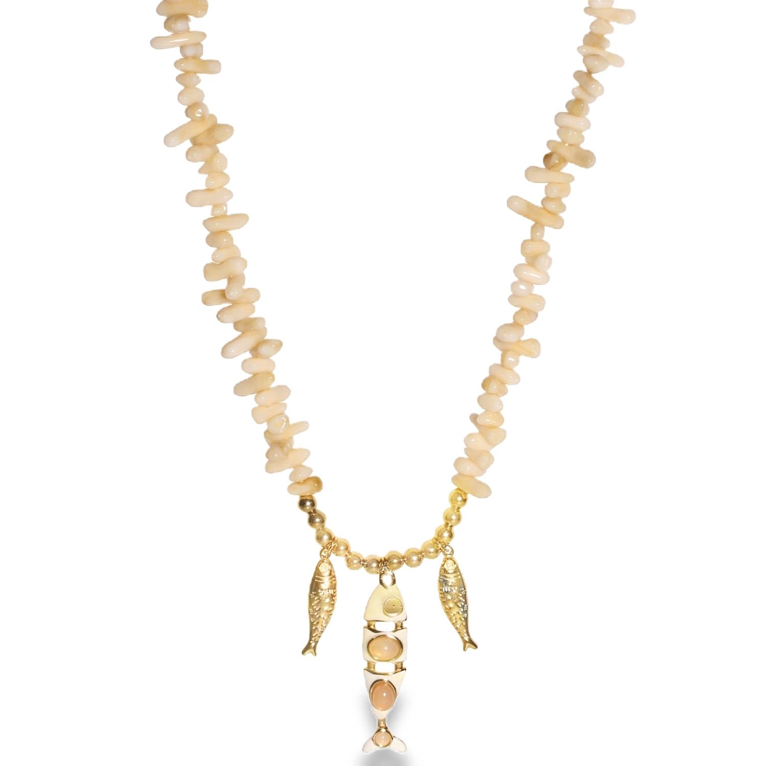Ce collier unique se distingue par son allure bohème-chic et son inspiration marine. Conçu pour capturer l'essence des vacances et du grand large, il mélange habilement textures brutes et finitions raffinées.
