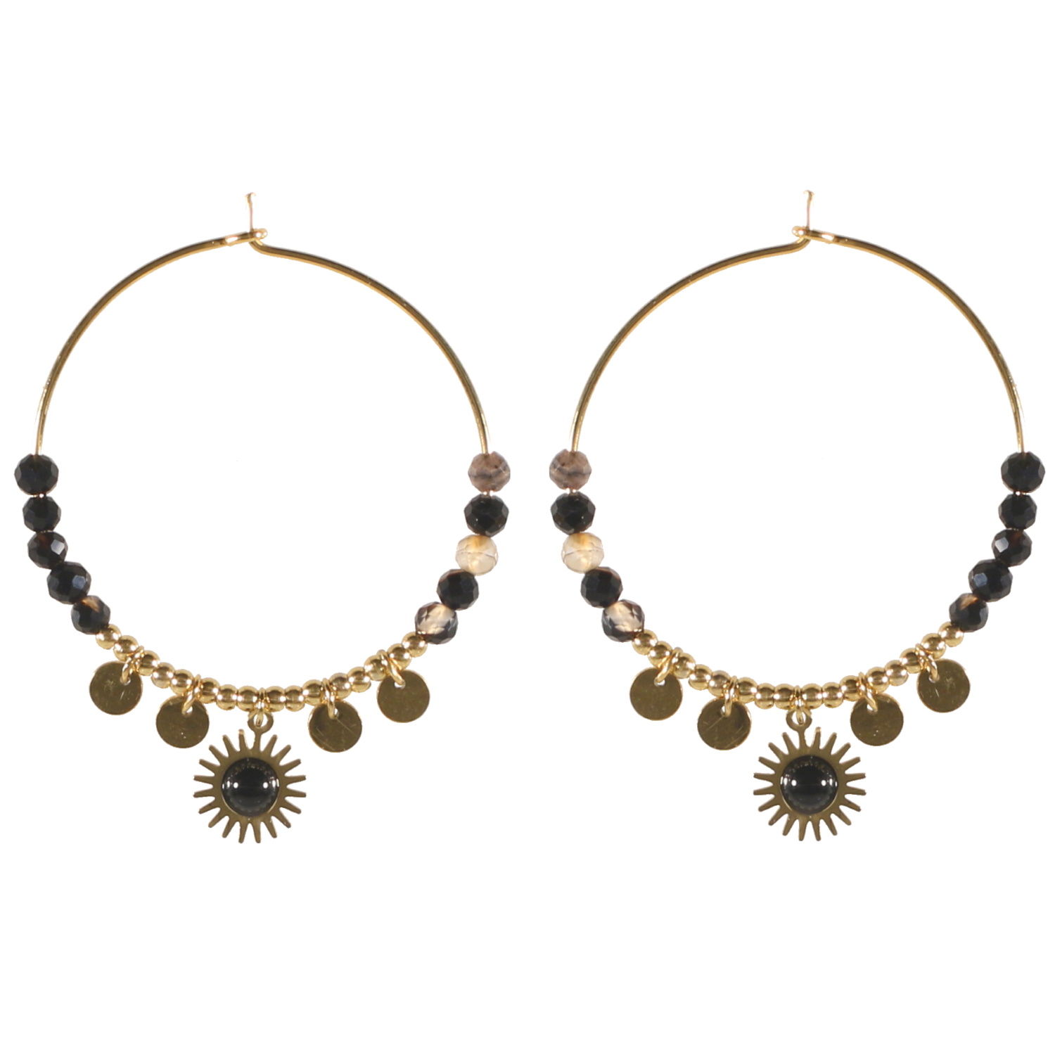 Boucles d'oreilles créoles en acier doré surmontées de perles de couleur en pierre naturelle et en acier doré et d'un soleil pendant en acier doré surmonté d'une pierre naturelle de couleur.