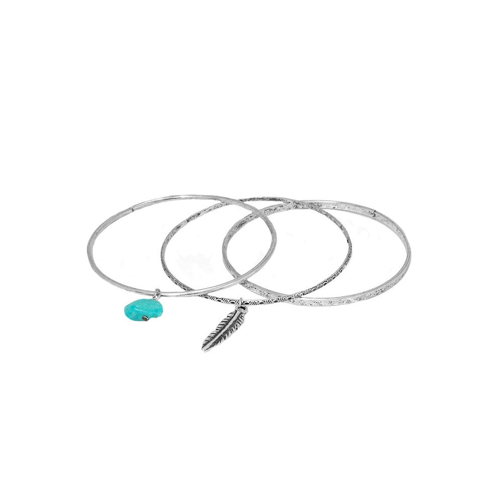 Lot de 3 bracelets joncs fantaisie rigides en métal argenté vieilli et pierre naturelle.