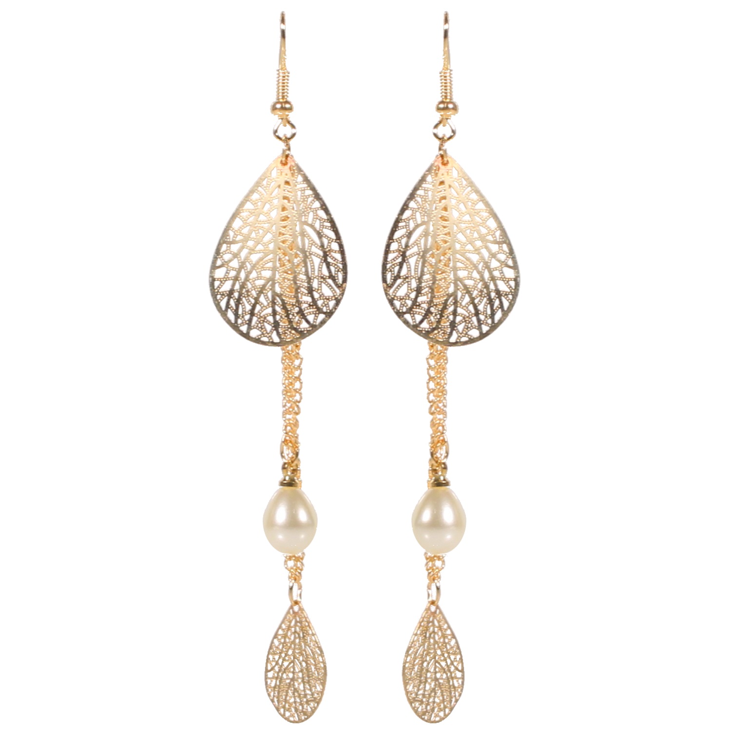 Boucles d'oreilles fantaisie en métal doré et perles synthétiques.