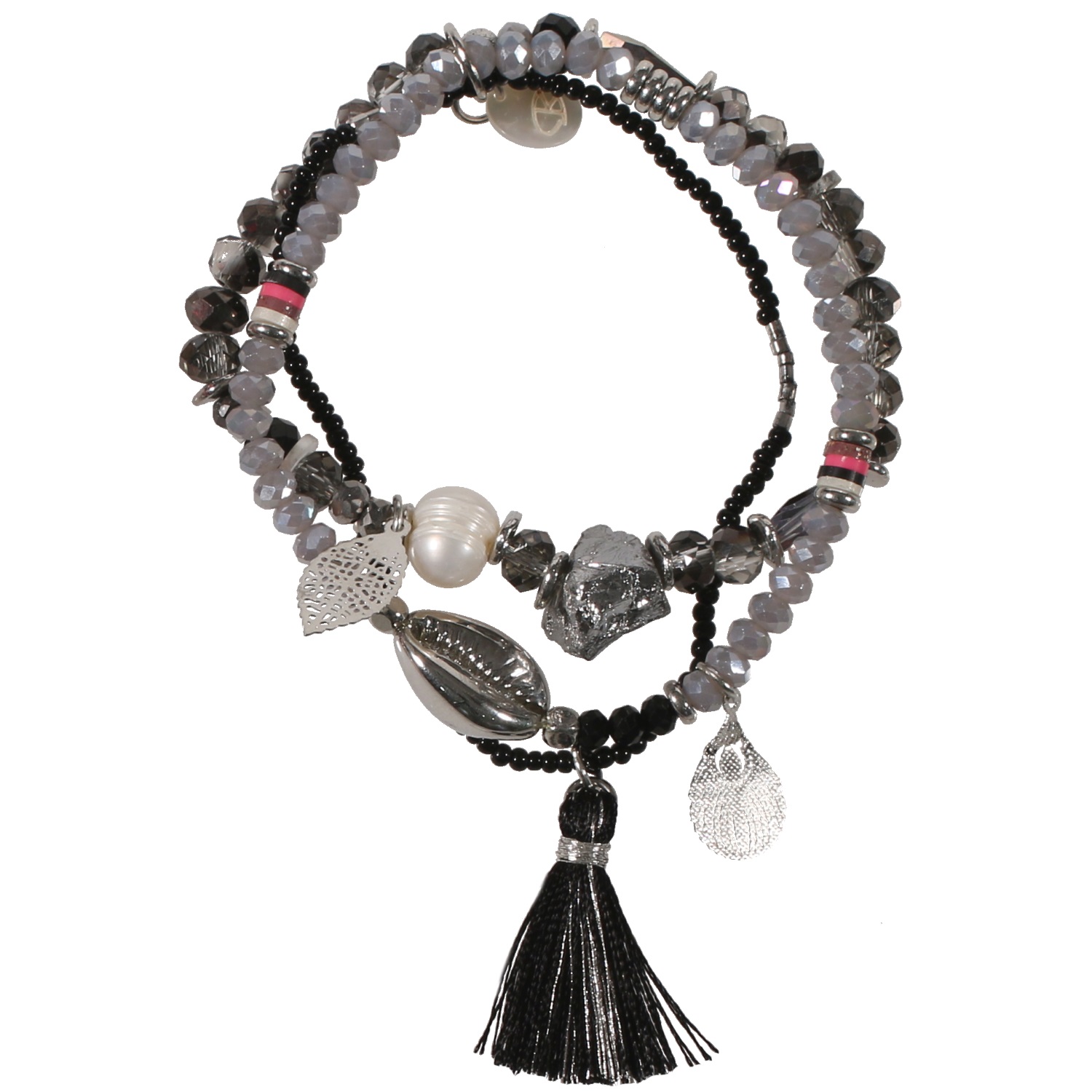 Lot de 3 bracelets fantaisie en métal argenté, rocaille, caoutchouc, pierre naturelle, nacre et textile. Coquillage Elastique Feuille Lot Pompon  Adolescent Adulte Femme Fille Hiver