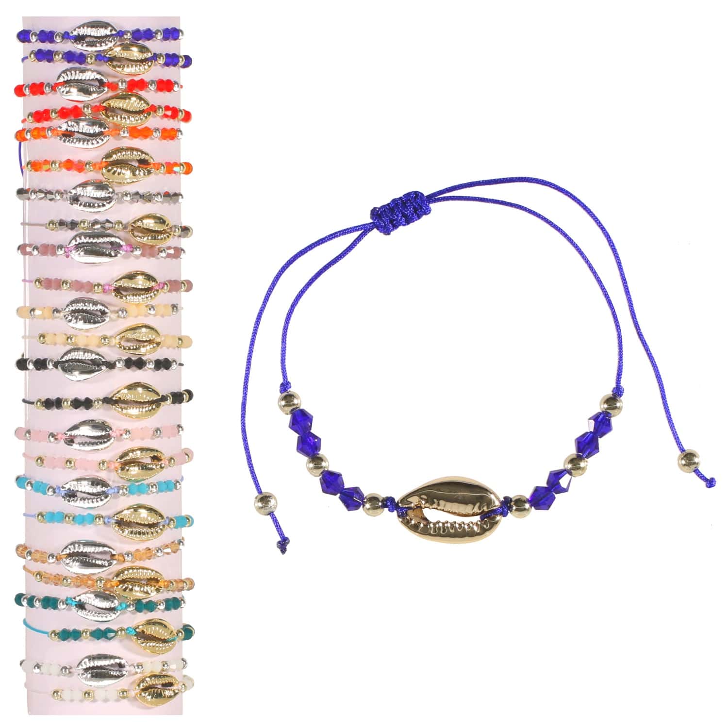 Bracelet avec cordon en coton, perles de couleur, perles et coquillage cauri en métal argenté ou métal doré.