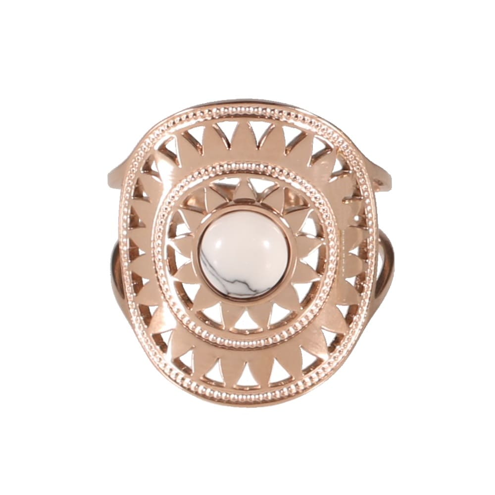 Description Bague motif soleil en acier rosé et pierre de couleur blanche. Taille ajustable. Largeur 20 mm Matière(s) Acier , Rocaille . L'acier utilisé dans la bijouterie existe sous plusieurs qualités. Nous utilisons principalement la qualité 316L, qualité qui est utilisée en chirurgie. Cet acier est donc inoxydable et reste très résistant. À noter Taille ajustable Couleur(s) dominante(s) Blanc , Rose Public Adolescent , Adulte . Genre Femme , Fille . Saison Indémodable . Thème(s) Nature . Collection Royale inca Cliquez sur une matière, un thème, une couleur ou une collection pour voir tous les articles associés.