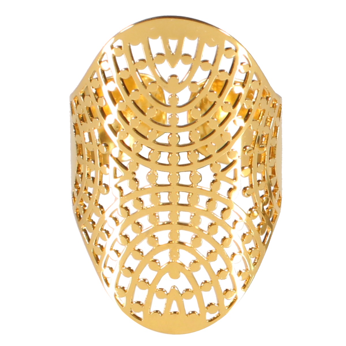 Description Bague ovale ajourée en acier doré. Taille ajustable. Largeur 28 mm Matière(s) Acier . L'acier utilisé dans la bijouterie existe sous plusieurs qualités. Nous utilisons principalement la qualité 316L, qualité qui est utilisée en chirurgie. Cet acier est donc inoxydable et reste très résistant. Couleur(s) dominante(s) Doré Public Adolescent , Adulte . Genre Femme , Fille . Saison Indémodable . Collection Dentelle moderne Cliquez sur une matière, un thème, une couleur ou une collection pour voir tous les articles associés.