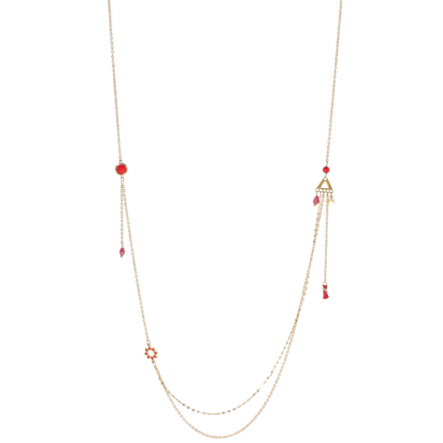 collier sautoir double rangs composé d'un collier de 78 cm de long en acier doré surmonté de perles de couleur, une étoile en émail et un mini pompon en textile ainsi qu'un collier de 81 cm de long en acier doré.