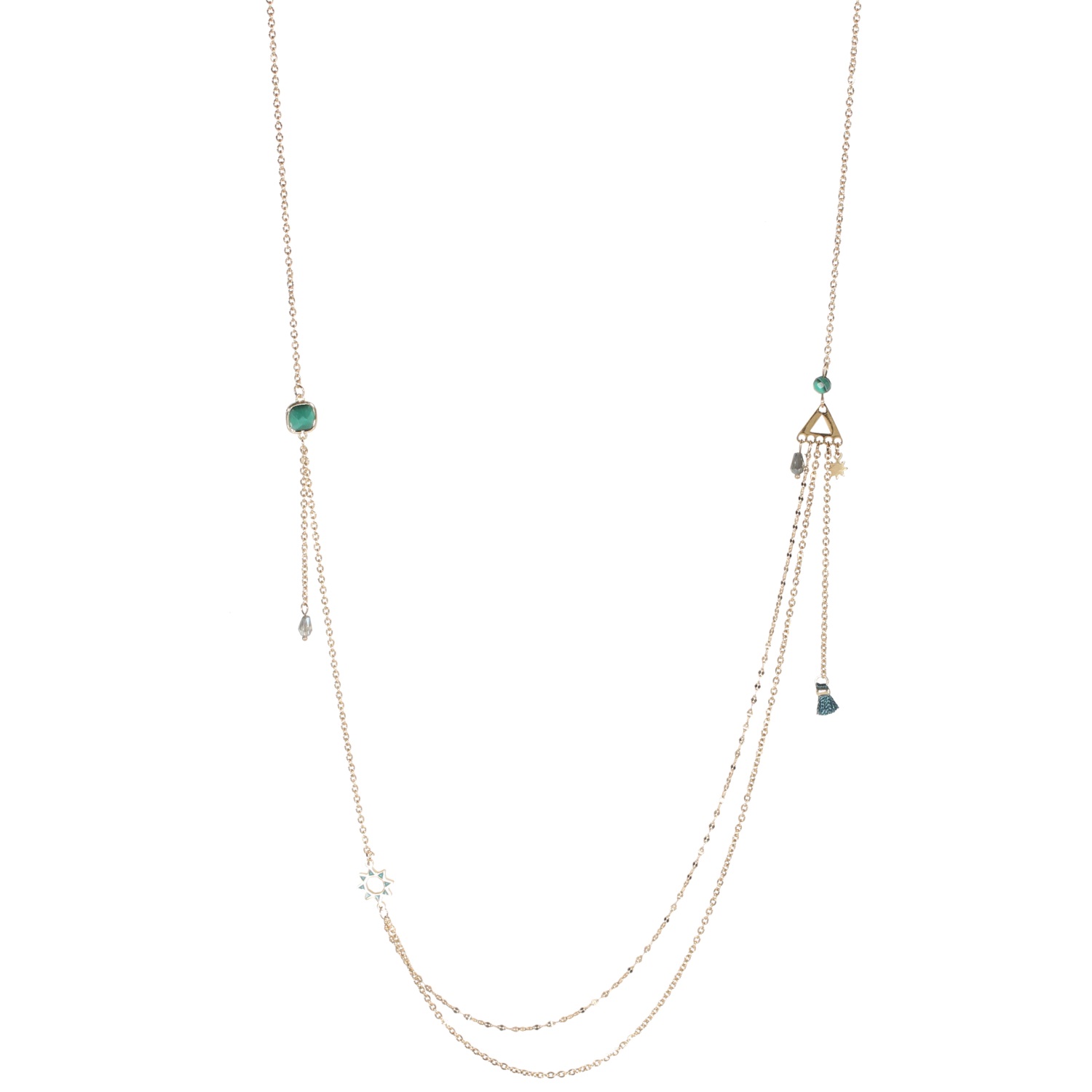 collier sautoir double rangs composé d'un collier de 78 cm de long en acier doré surmonté de perles d'imitation malachite, une étoile en émail et un mini pompon en textile ainsi qu'un collier de 81 cm de long en acier doré.