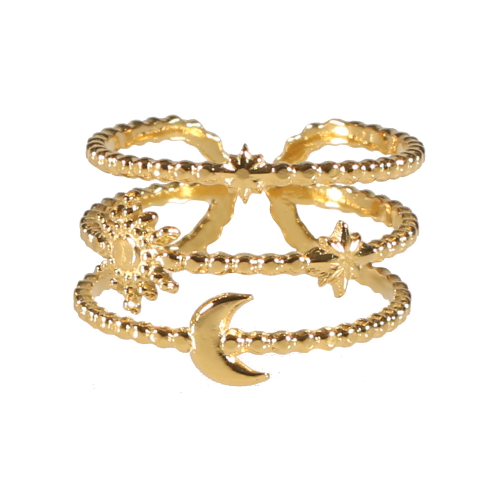 Description Bague triple rangs avec motifs de croissant de lune, étoiles et soleil en acier doré. Taille ajustable. Largeur 14 mm Matière(s) Acier . L'acier utilisé dans la bijouterie existe sous plusieurs qualités. Nous utilisons principalement la qualité 316L, qualité qui est utilisée en chirurgie. Cet acier est donc inoxydable et reste très résistant. Fermoir Aucun Couleur(s) dominante(s) Doré Public Adolescent , Adulte . Genre Femme , Fille . Saison Indémodable . Thème(s) Nature . Collection Astre sublime Cliquez sur une matière, un thème, une couleur ou une collection pour voir tous les articles associés.