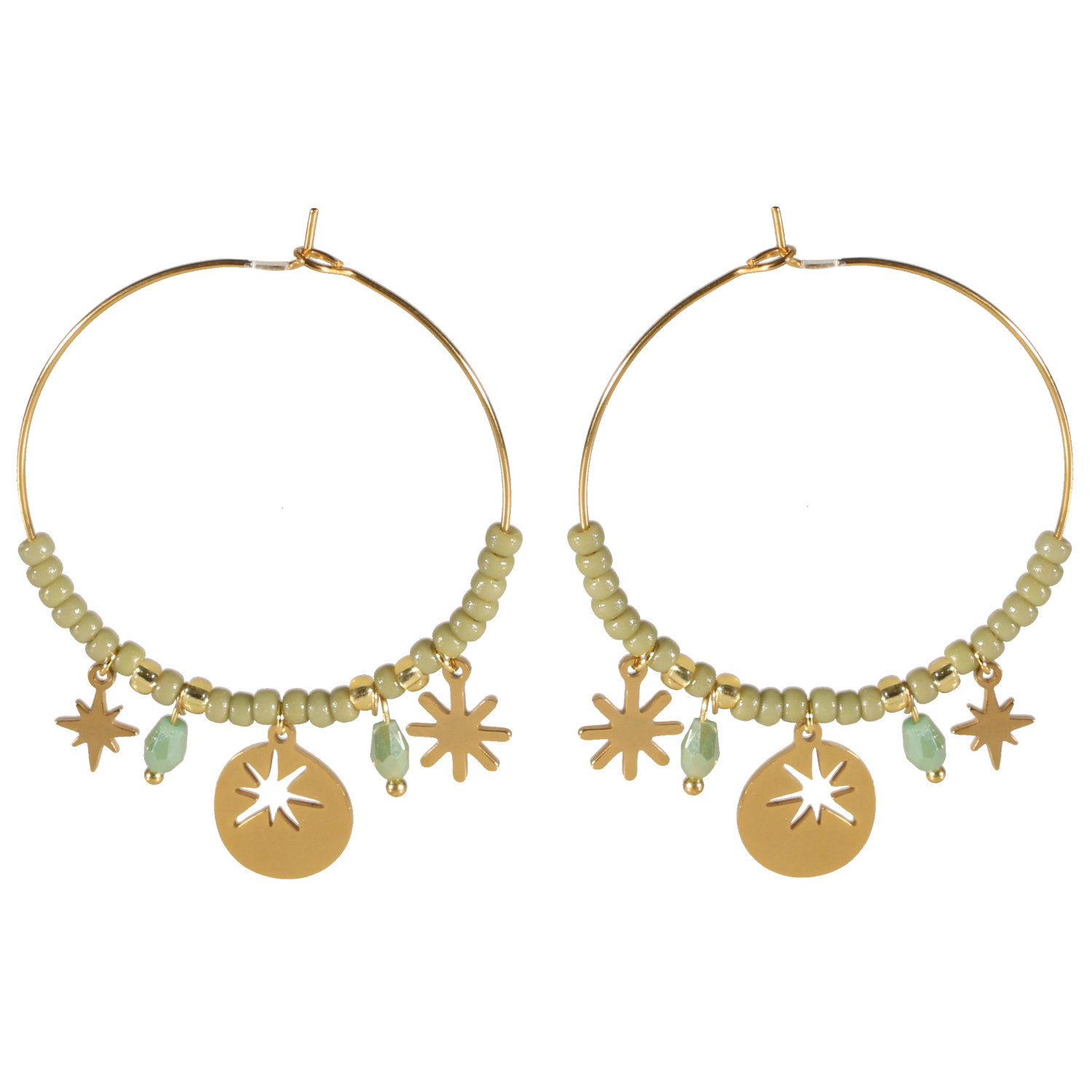 Boucles d'oreilles créoles composées de pendants (étoiles, flocons et pastilles avec étoile ajourée) en acier doré et de perles de couleur verte.
