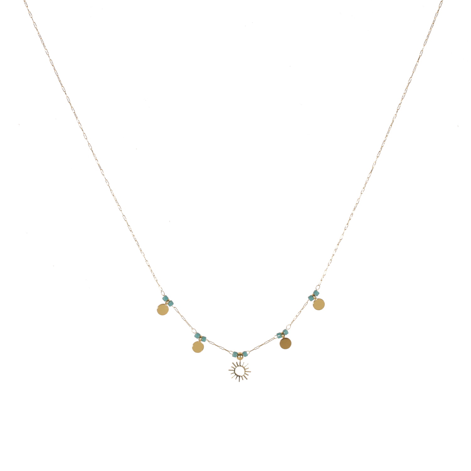 Description Collier composé d'une chaîne avec pampilles rondes et un pendentif soleil en acier doré et des perles de couleur turquoise. Fermoir mousqueton avec 5 cm de rallonge. Cliquez sur une matière, un thème, une couleur ou une collection pour voir tous les articles associés.