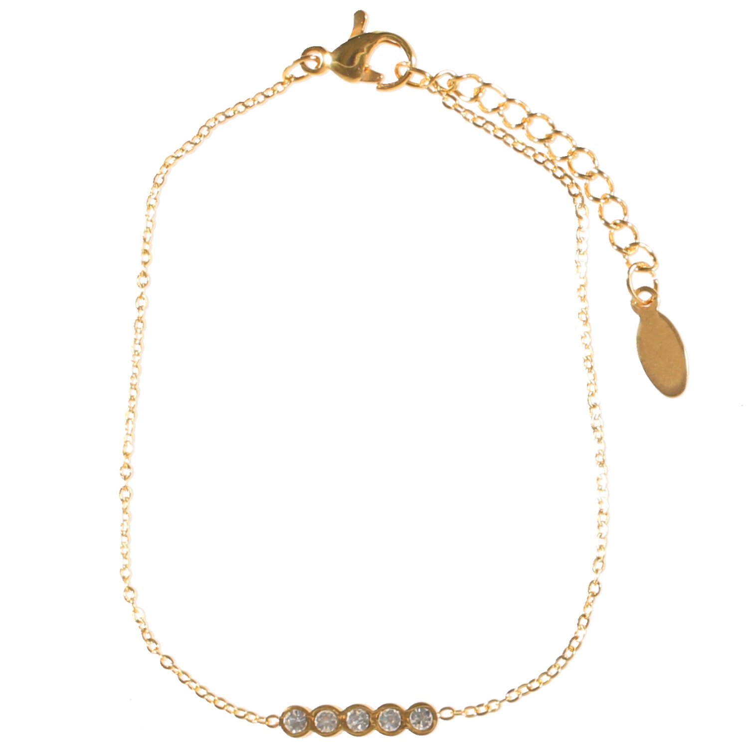 Description Bracelet en acier doré et cinq cristaux en verre. Longueur 16+3 cm [Guide des tailles] Largeur 3 mm Matière(s) Acier , Verre . L'acier utilisé dans la bijouterie existe sous plusieurs qualités. Nous utilisons principalement la qualité 316L, qualité qui est utilisée en chirurgie. Cet acier est donc inoxydable et reste très résistant. Fermoir Mousqueton Couleur(s) dominante(s) Doré Public Adolescent , Adulte . Genre Femme , Fille . Saison Indémodable . Cliquez sur une matière, un thème, une couleur ou une collection pour voir tous les articles associés.
