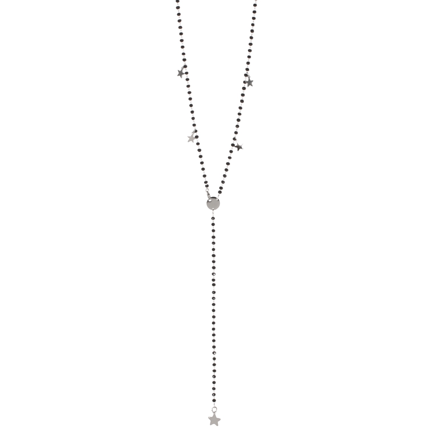 Description Collier sautoir forme Y avec étoiles et pastille ronde en acier argenté et perles de couleur noire. Cliquez sur une matière, un thème, une couleur ou une collection pour voir tous les articles associés.