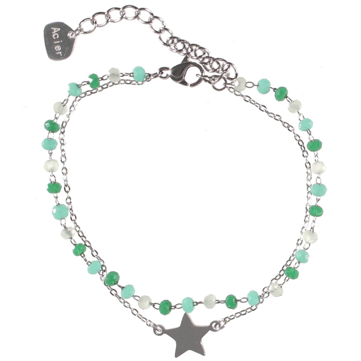 Description Bracelet double rangs composé d'une chaîne en acier argenté avec perles de couleur verte ainsi qu'une chaîne avec étoile en acier argenté. Cliquez sur une matière, un thème, une couleur ou une collection pour voir tous les articles associés.
