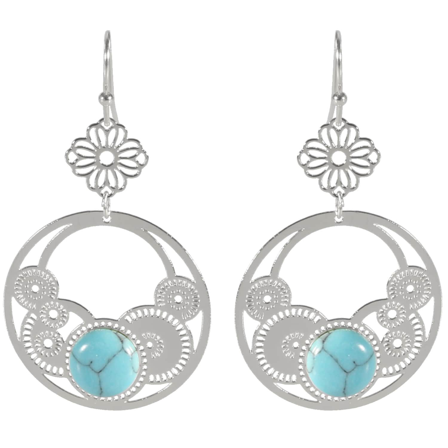 Description Boucles d'oreilles pendantes avec fleurs et cercles en acier argenté et pierres d'imitation turquoise. Largeur 26 mm Hauteur 47 mm Matière(s) Acier , Rocaille . L'acier utilisé dans la bijouterie existe sous plusieurs qualités. Nous utilisons principalement la qualité 316L, qualité qui est utilisée en chirurgie. Cet acier est donc inoxydable et reste très résistant. Fermoir Crochets Couleur(s) dominante(s) Argenté , Bleu Public Adolescent , Adulte . Genre Femme , Fille . Saison Indémodable . Thème(s) Fleurs , Nature . Cliquez sur une matière, un thème, une couleur ou une collection pour voir tous les articles associés.