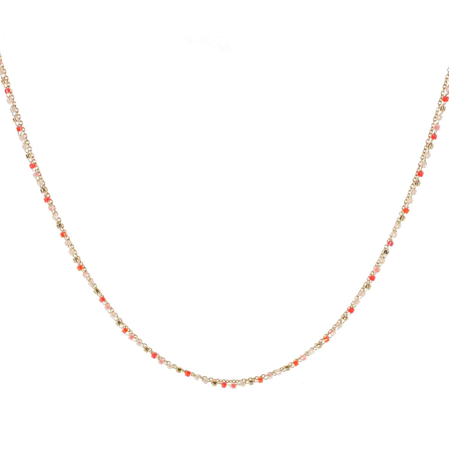 Description Collier double rangs composé d'un collier chaîne en acier doré ainsi que d'un collier en acier doré avec perles de couleur rouge. Fermoir mousqueton avec rallonge de 4.5 cm. Longueur 41+4.5 cm [Guide des tailles] Largeur 2 mm Matière(s) Acier , Rocaille . L'acier utilisé dans la bijouterie existe sous plusieurs qualités. Nous utilisons principalement la qualité 316L, qualité qui est utilisée en chirurgie. Cet acier est donc inoxydable et reste très résistant. Fermoir Mousqueton Couleur(s) dominante(s) Doré , Rouge Public Adolescent , Adulte . Genre Femme , Fille . Saison Eté . Collection Zeste d'été Cliquez sur une matière, un thème, une couleur ou une collection pour voir tous les articles associés.