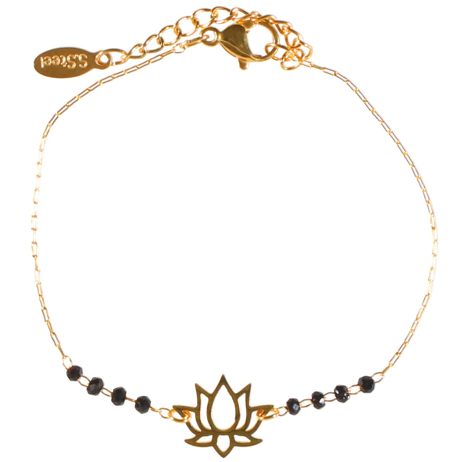 Bracelet avec fleur de lotus en acier doré et perles de couleur noire.