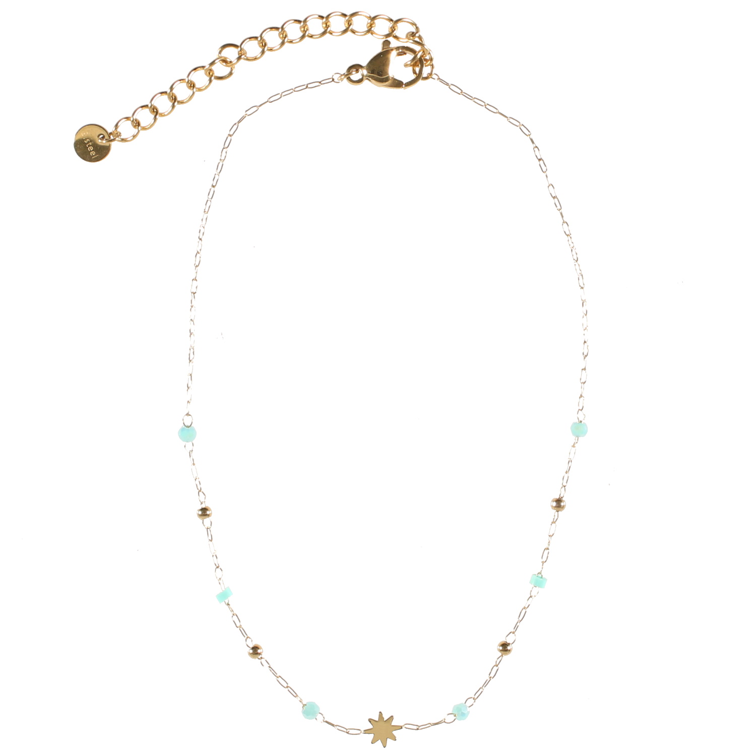 Bracelet chaîne de cheville avec étoile en acier doré surmonté de perles de couleur.