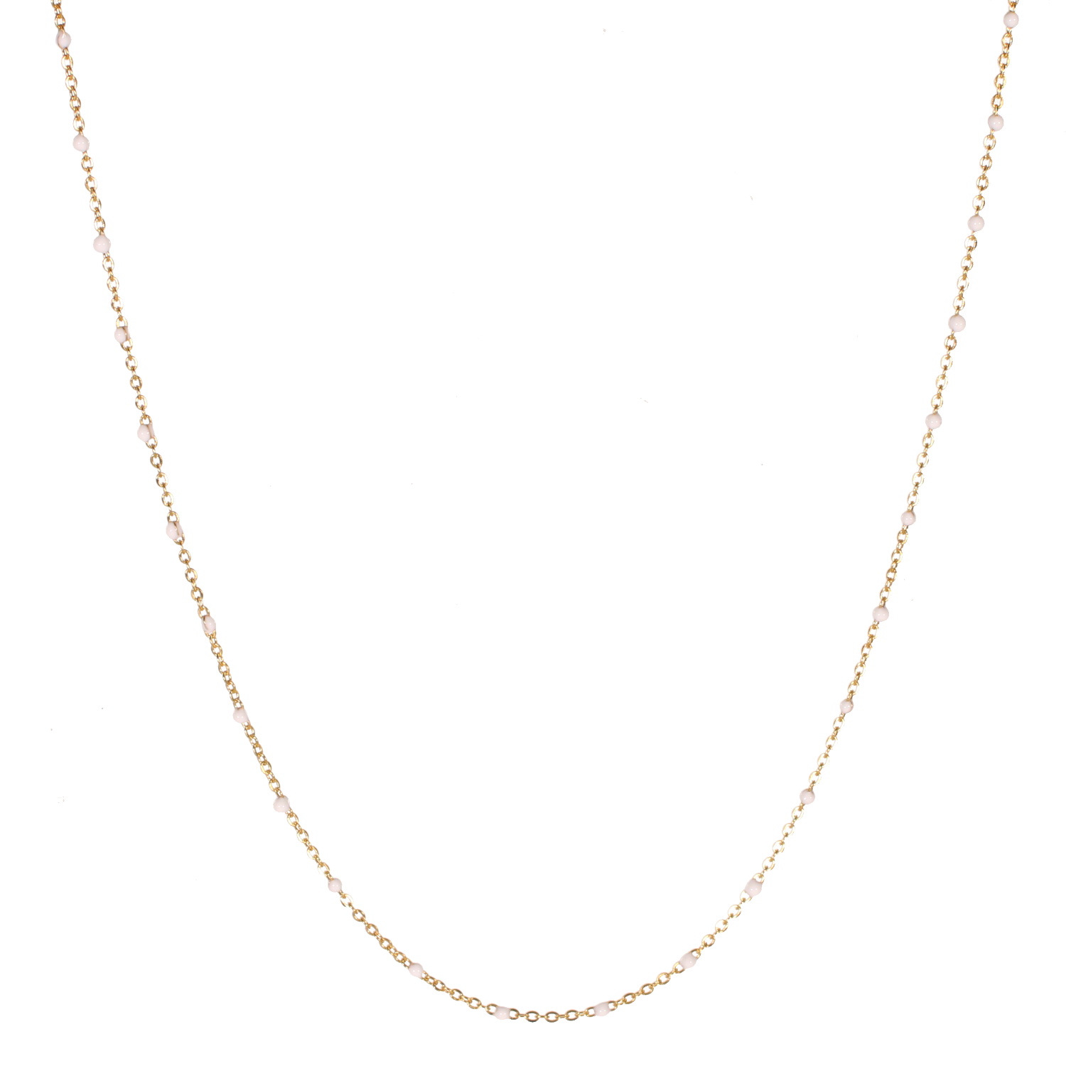 Description Collier composé d'une chaîne en acier doré et de perles en émail de couleur blanche. Fermoir mousqueton avec 7 cm de rallonge. Cliquez sur une matière, un thème, une couleur ou une collection pour voir tous les articles associés.