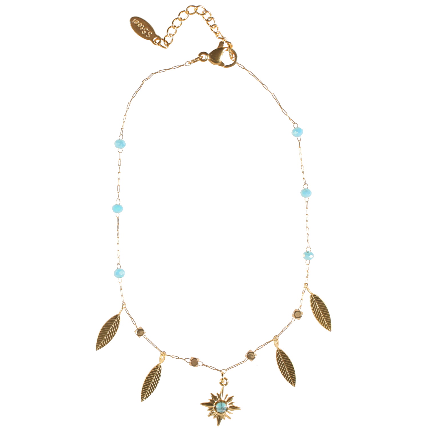 Description Bracelet chaîne de cheville composé d'une chaîne avec pampilles plumes en acier doré, de perles de couleur turquoise et d'un pendentif étoile surmontée d'une pierre de couleur turquoise. Fermoir mousqueton avec 3 cm de rallonge. Longueur 22+3 cm [Guide des tailles] Largeur 15 mm Matière(s) Acier , Rocaille . L'acier utilisé dans la bijouterie existe sous plusieurs qualités. Nous utilisons principalement la qualité 316L, qualité qui est utilisée en chirurgie. Cet acier est donc inoxydable et reste très résistant. Fermoir Mousqueton Couleur(s) dominante(s) Bleu , Doré Public Adolescent , Adulte . Genre Femme , Fille . Saison Indémodable . Thème(s) Nature . Cliquez sur une matière, un thème, une couleur ou une collection pour voir tous les articles associés.