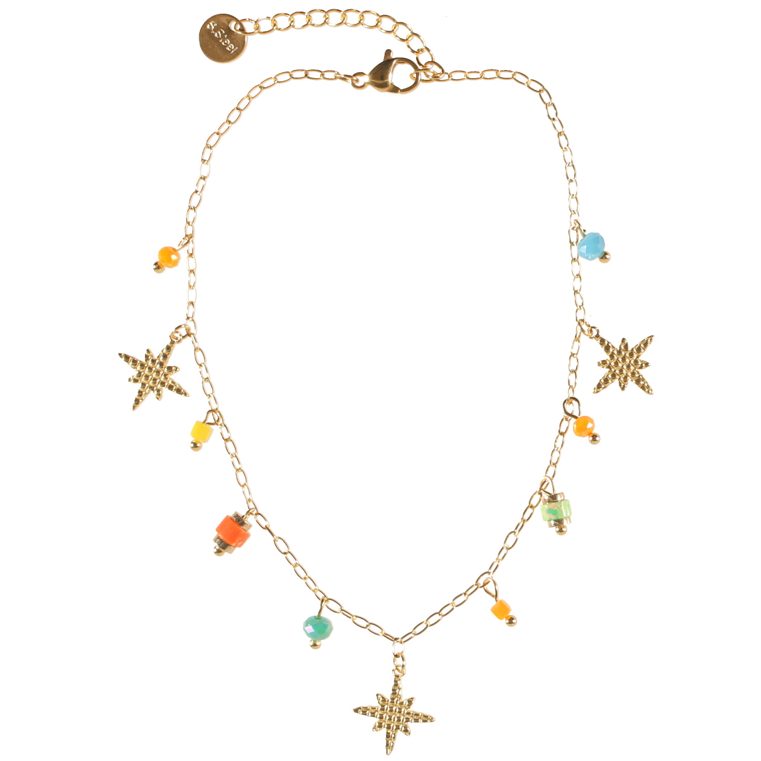 Description Bracelet chaîne de cheville composé d'une chaîne en acier doré, de pampilles de perles multicolore et 3 pendants étoiles en acier doré. Fermoir mousqueton avec 3 cm de rallonge. Cliquez sur une matière, un thème, une couleur ou une collection pour voir tous les articles associés.