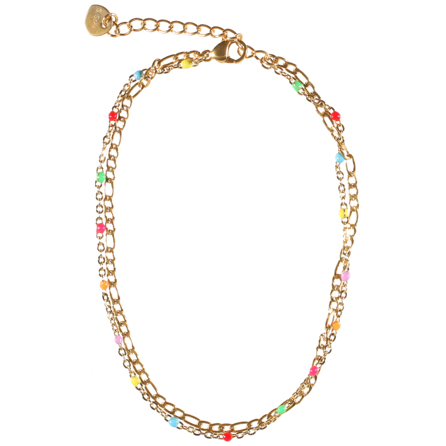 Bracelet chaîne de cheville double rangs composé d'une chaîne en acier doré et d'une chaîne en acier doré avec perles en émail multicolore.