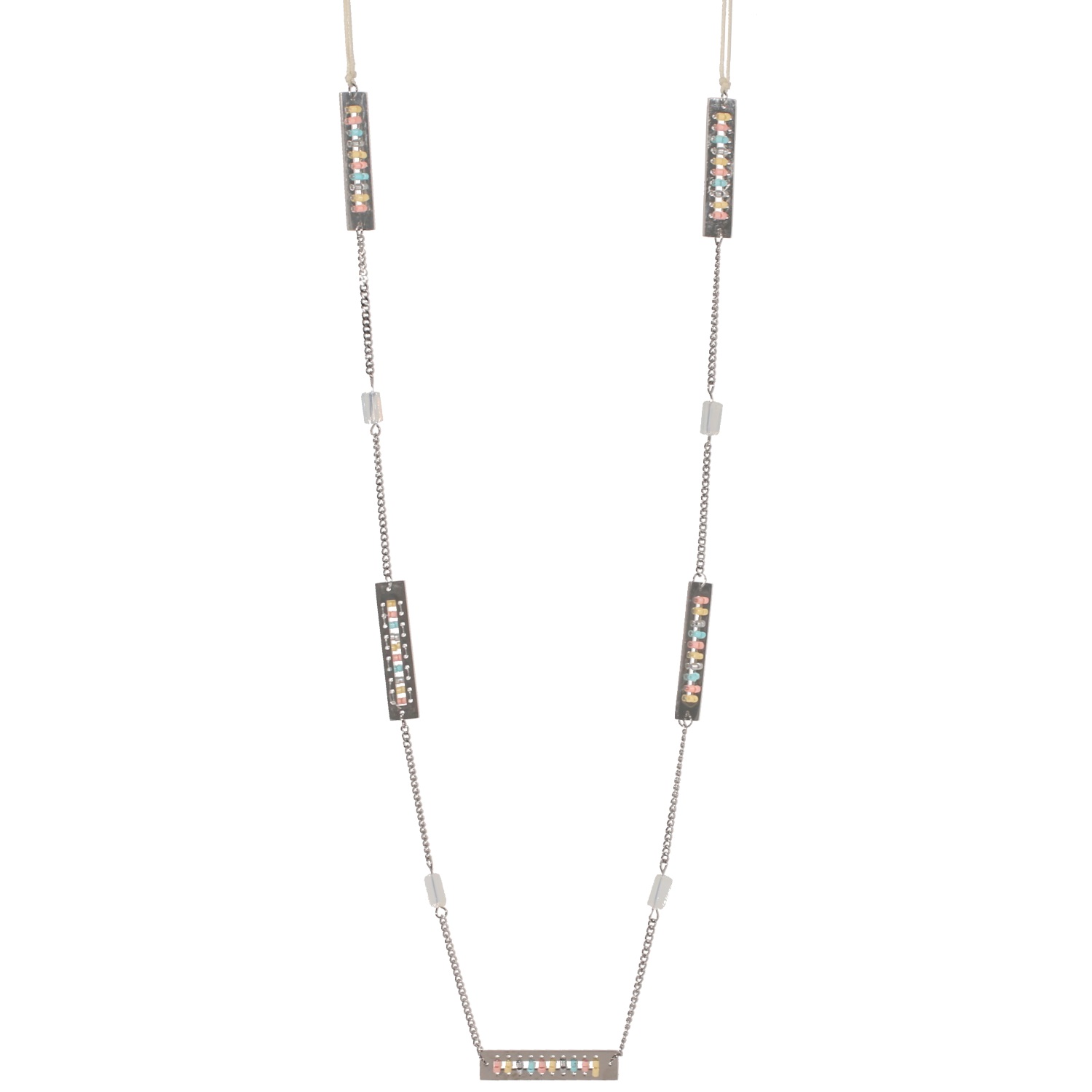 Collier sautoir en acier, coton et pierres synthétiques.