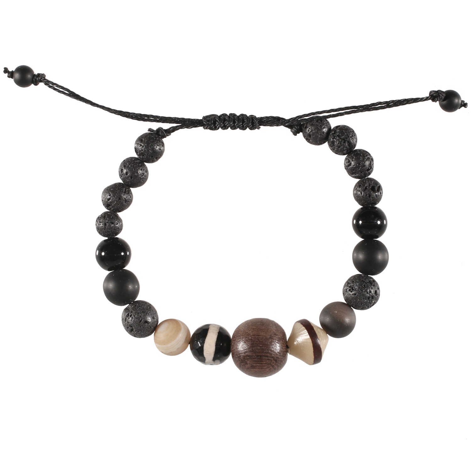 Bracelet fantaisie avec cordon en coton ciré, boule en bois, perles en verre et pierres d'imitation de lave volcanique.