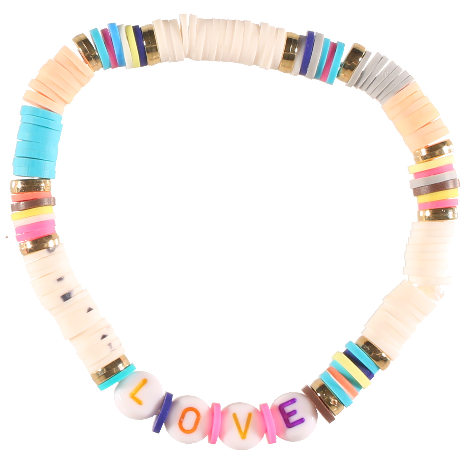 Bracelet fantaisie élastique composé de perles cylindriques heishi en résine synthétique et caoutchouc multicolore, ainsi que des perles rondes avec des lettres pour faire le mot LOVE.