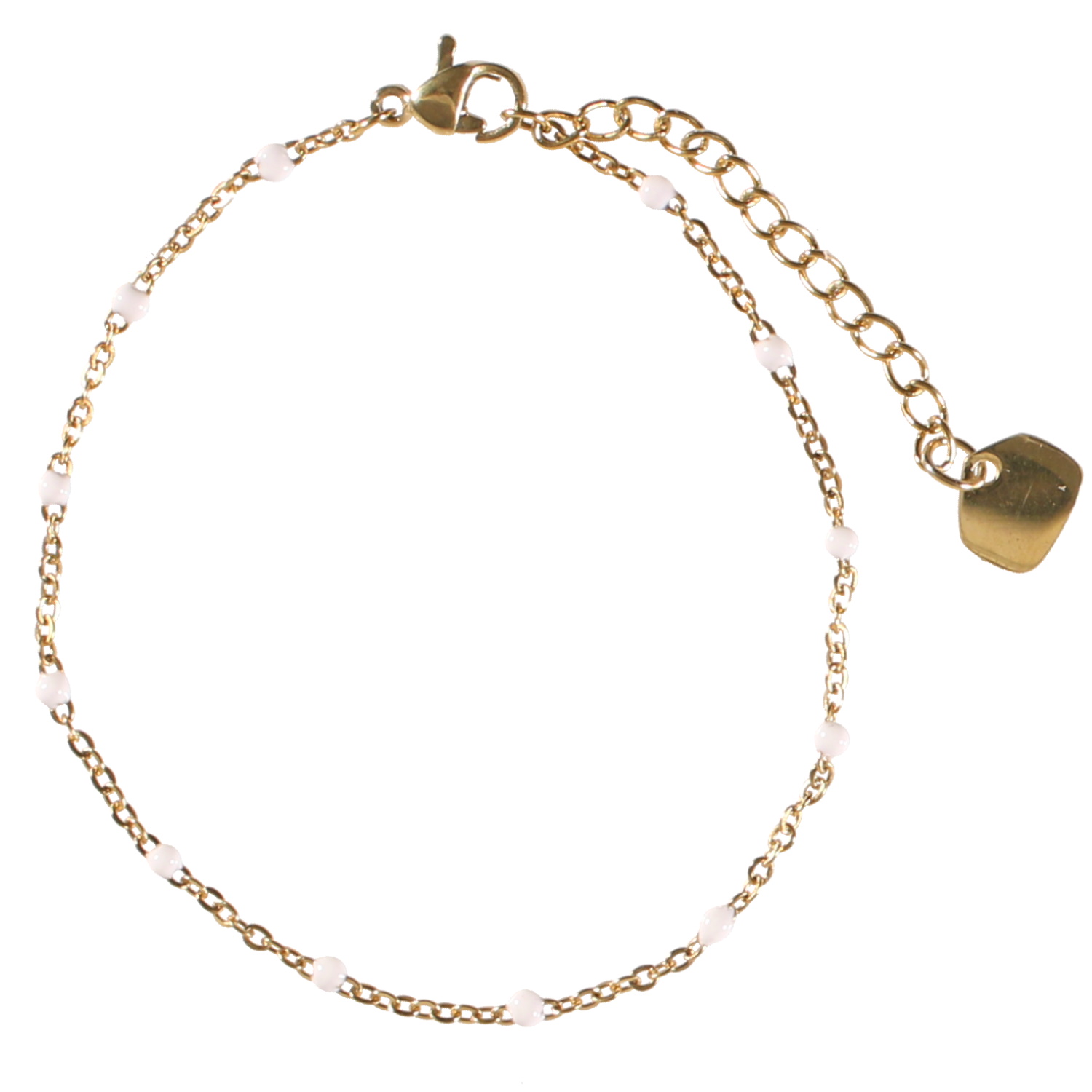 Description Bracelet composé d'une chaîne en acier doré et de perles en émail de couleur blanche. Fermoir mousqueton avec 4 cm de rallonge. Cliquez sur une matière, un thème, une couleur ou une collection pour voir tous les articles associés.