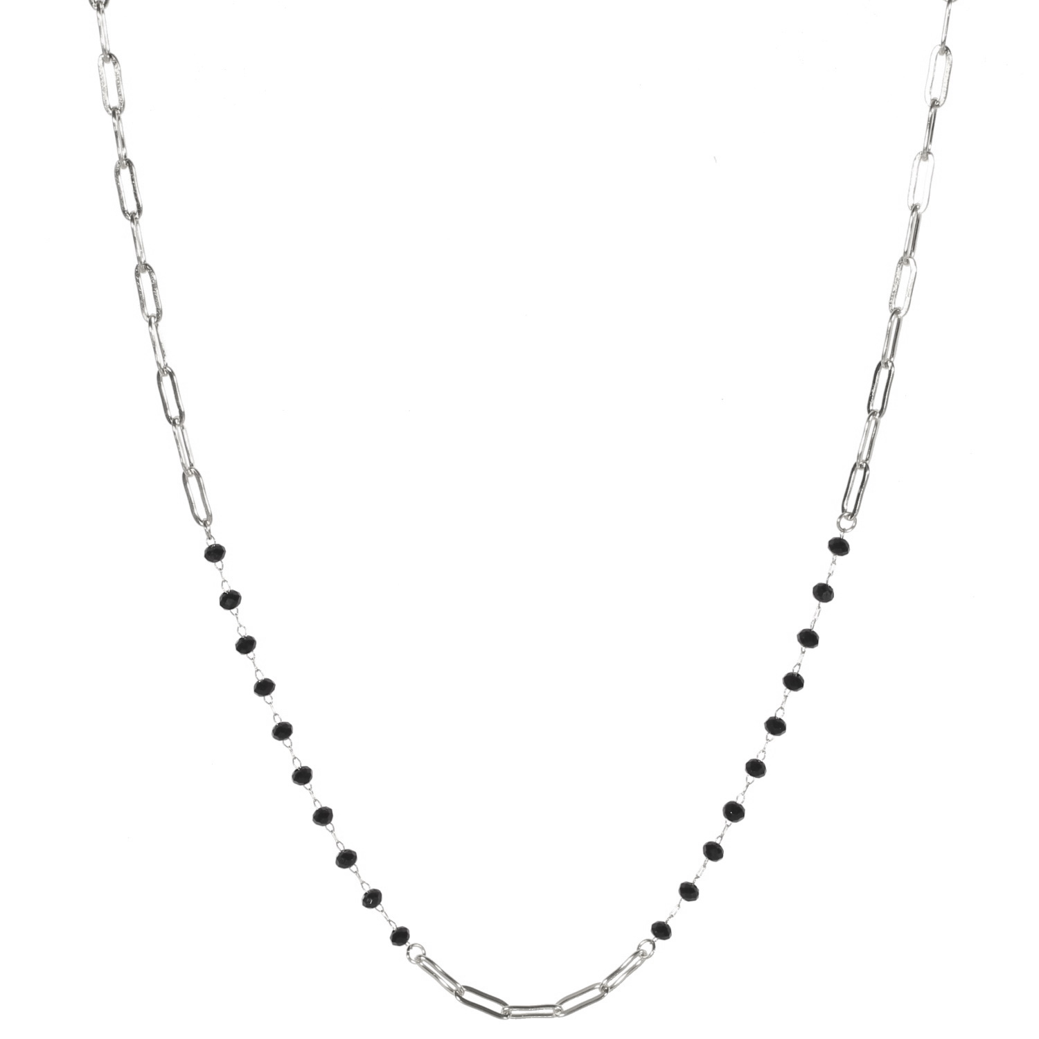 Description Collier composé d'une chaîne en acier argenté avec perles de couleur noire et d'une chaîne en acier argenté. Fermoir mousqueton avec 5 cm de rallonge. Cliquez sur une matière, un thème, une couleur ou une collection pour voir tous les articles associés.