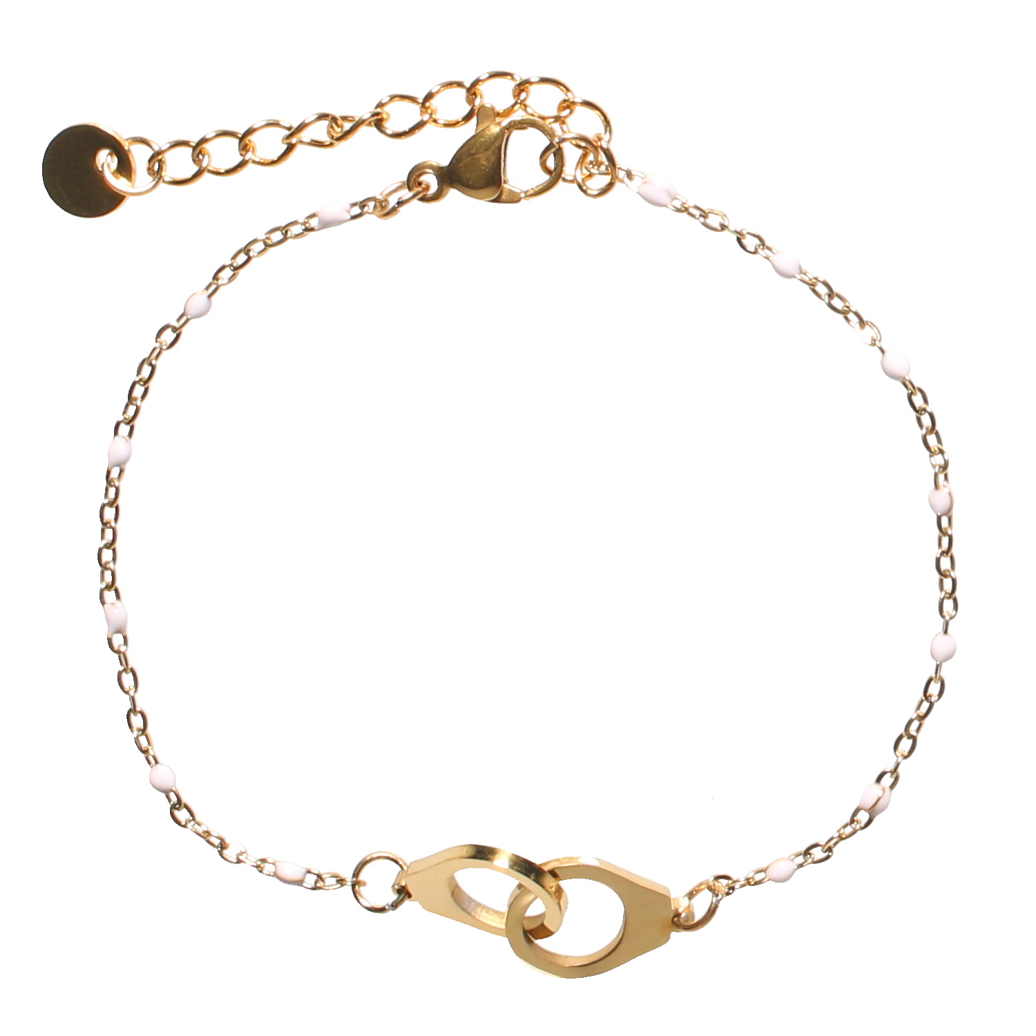 Description Bracelet composé d'une chaîne et d'une paire de menottes en acier doré et de perles en émail de couleur blanc. Fermoir mousqueton avec 3 cm de rallonge. Cliquez sur une matière, un thème, une couleur ou une collection pour voir tous les articles associés.