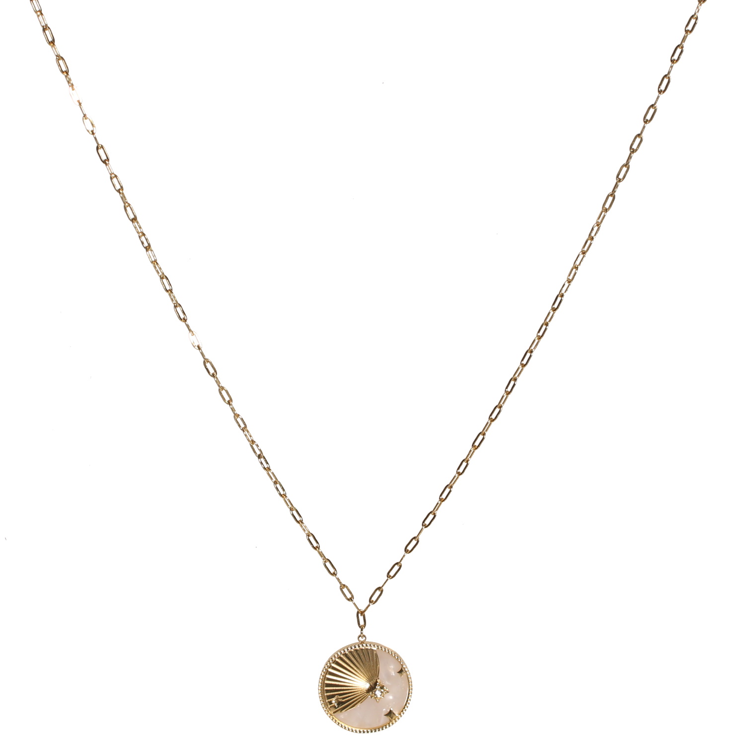 Collier composé d'une chaîne en acier doré et d'un pendentif rond serti d'une pastille blanche pavée d'étoiles en acier doré dont une sertie d'un cristal.
