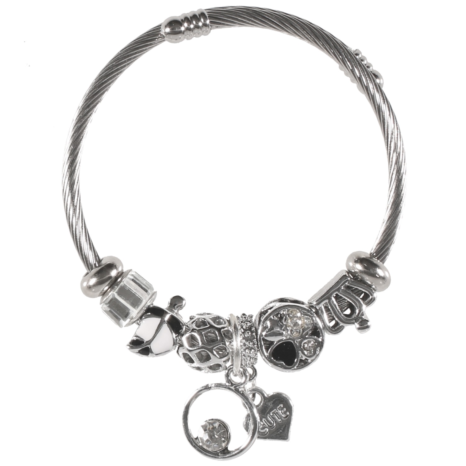 Bracelet fantaisie avec breloques en métal argenté, émail et strass.