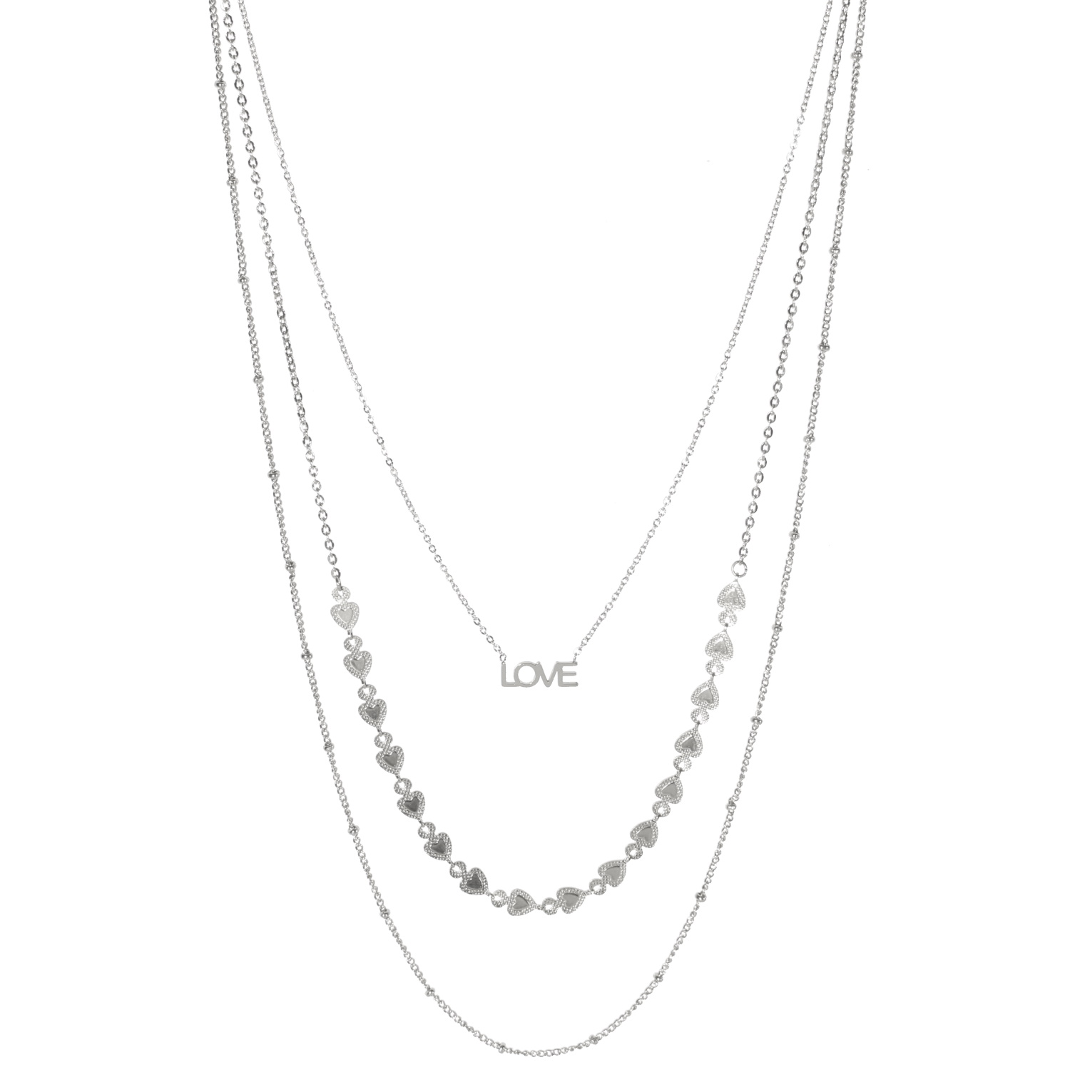 Collier triple rangs composé d'une chaîne de 40 cm de long avec le mot LOVE en acier argenté, un collier de 47 cm de long avec cœurs en acier argenté, ainsi qu'une chaîne de 55 cm de long en acier argenté.